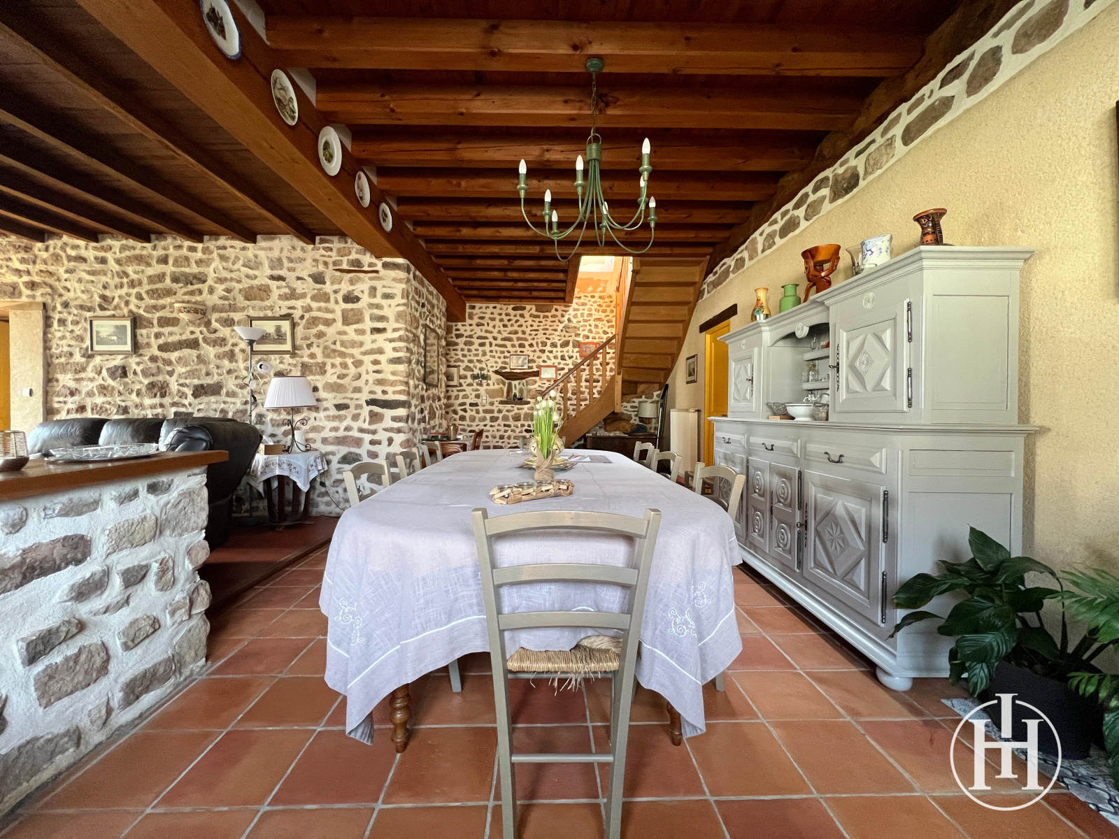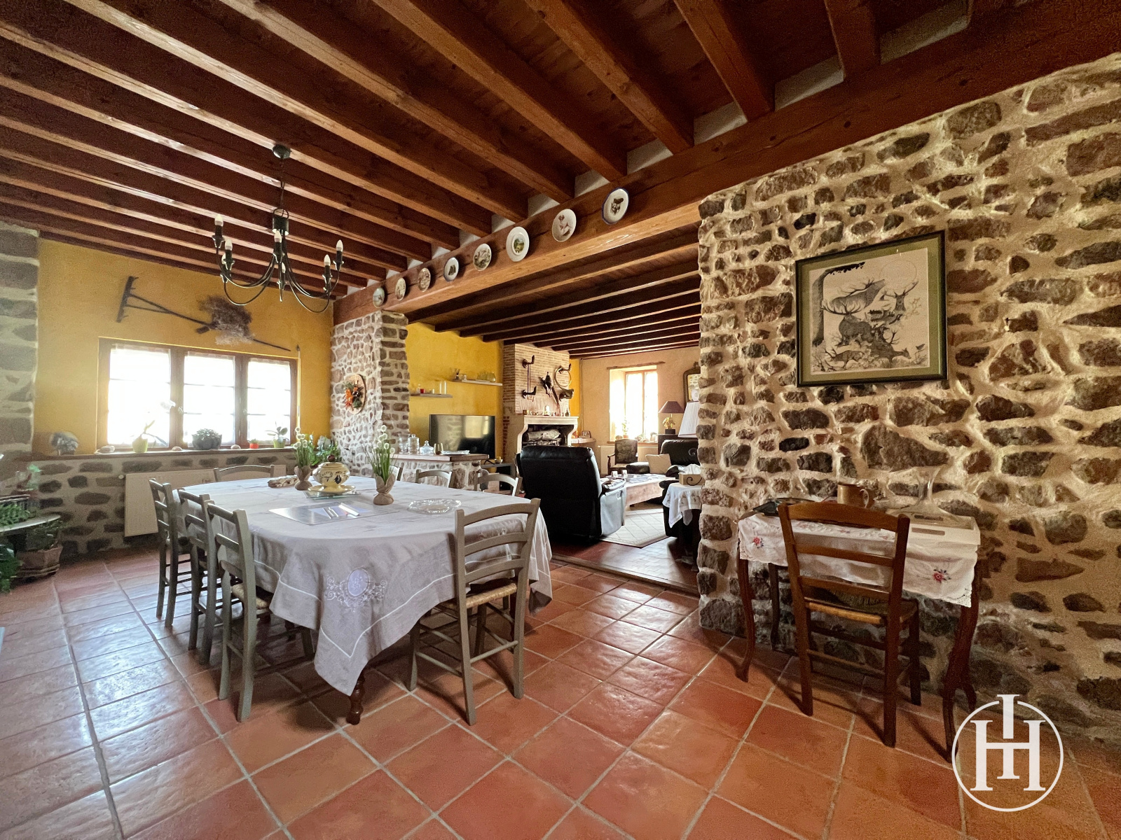 La maison, pleine de charme, propose de beaux volumes avec un séjour de 54 m² agrémenté de pierres et poutres apparentes. L’ensemble reste fonctionnel et permet d’envisager des aménagements selon vos projets, une vie de plain pied est possible. À l'étage vous disposez de quatre chambres et une pièce pouvant être aménagée en salle d'eau.